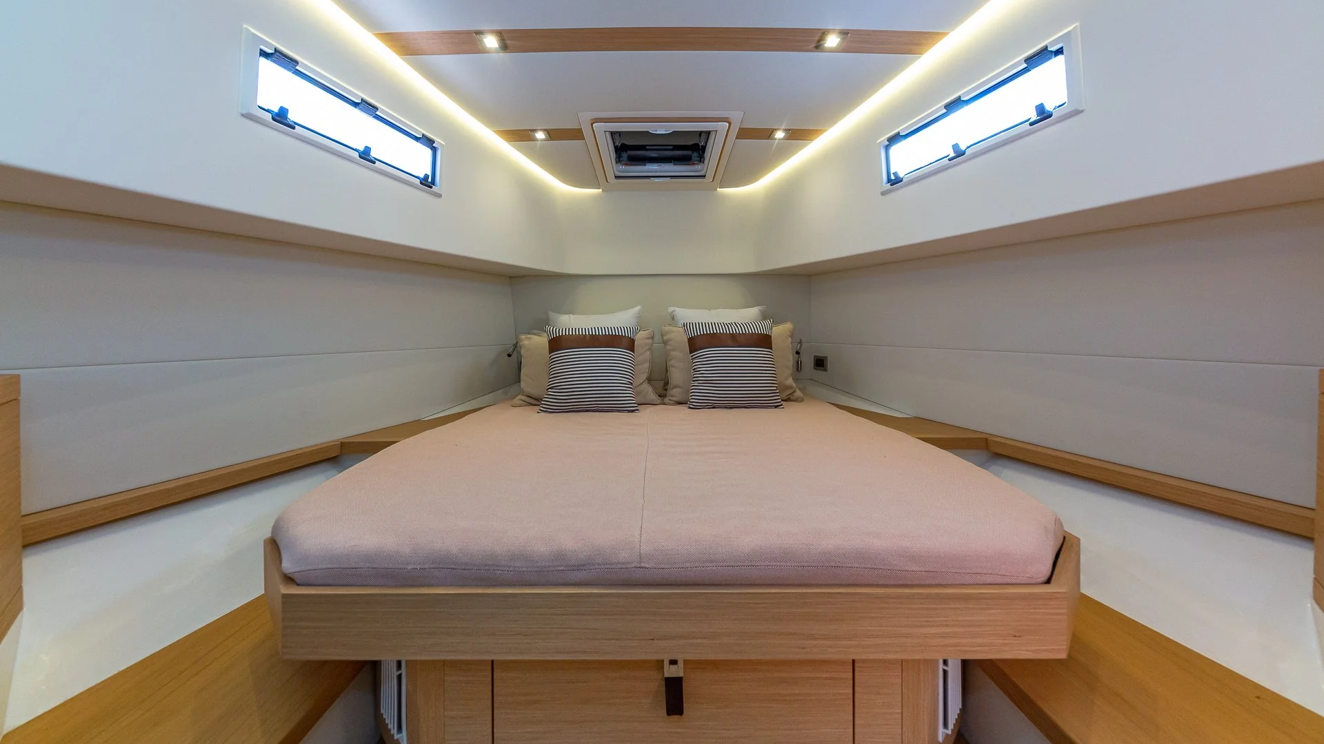 Luxurious lounging spaces at both the bow and stern accommodate up to six guests comfortably, with a sunbathing area for three. The Pardo 38 stands out with its spacious, well-lit interior, generous heights, and excellent natural ventilation, creating an unmatched spatial distribution for a 38-footer.