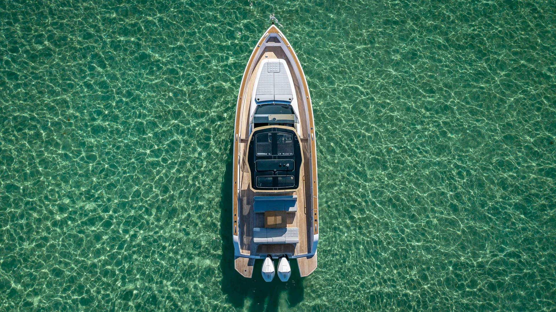 Safety and ease of movement are prioritized with a walkaround deck design. The state-of-the-art T-Top, crafted with pre-preg carbon technology, covers the wheelhouse, while an optional electrical bimini offers shade for the stern's dining/lounging area.
